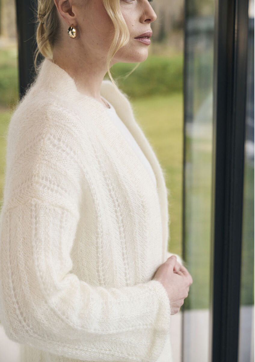 Ovington is a lightweight cardigan in Alpaca Haze which is held double throughout. This mid-length cardigan features a delicate all-over lace pattern with folded cuffs and hems which add weight and drape to the garment.