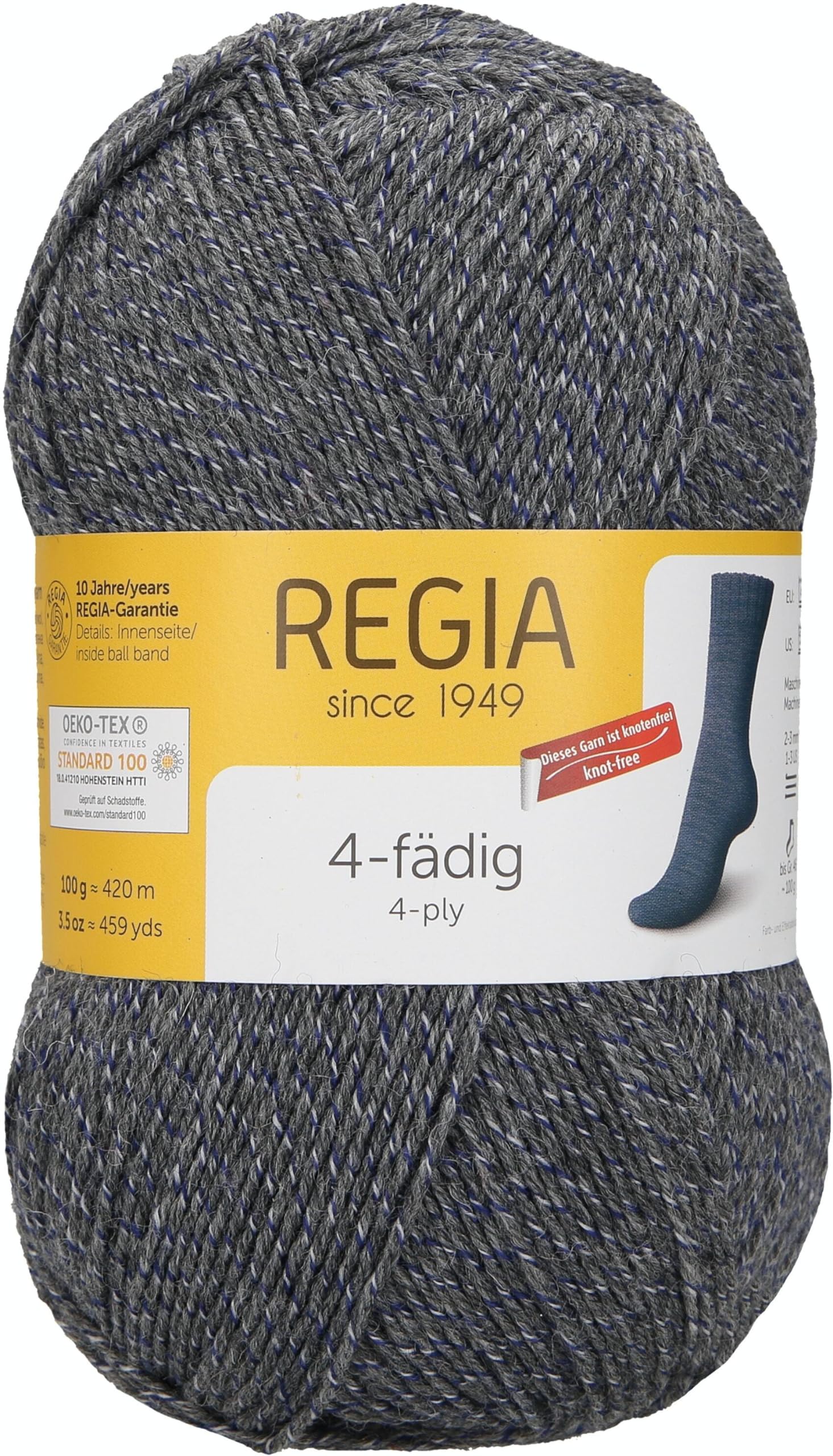 "The popular Regia sock yarn. Four single yarns are twisted or 'plied' together to give you the ideal yarn weight for hand-knit socks. Two 50 g balls are enough to knit a pair of socks, up to (European) size 46*. Machine washable up to 40° C (100° F) and can be machine dried. Non-felting. Offering long-lasting wear and great shape retention."