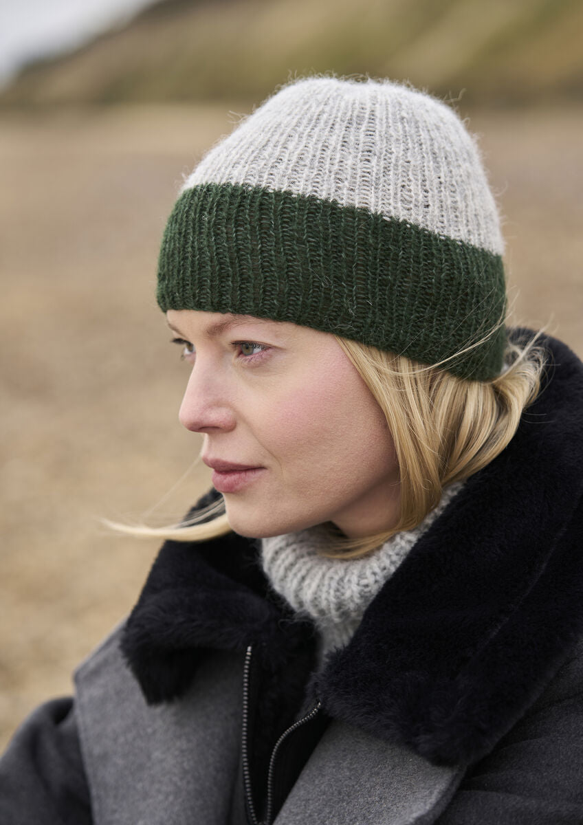 Cosy mittens made with Alpaca Cotton, Shell is a quick pattern to knit up in the round on double pointed needles. Heydon is a simple ribbed beanie with options. Choose to work in the round or flat and a solid shade or colour block. Also using Alpaca Cotton it makes a lovely set to match with the Shell mittens.